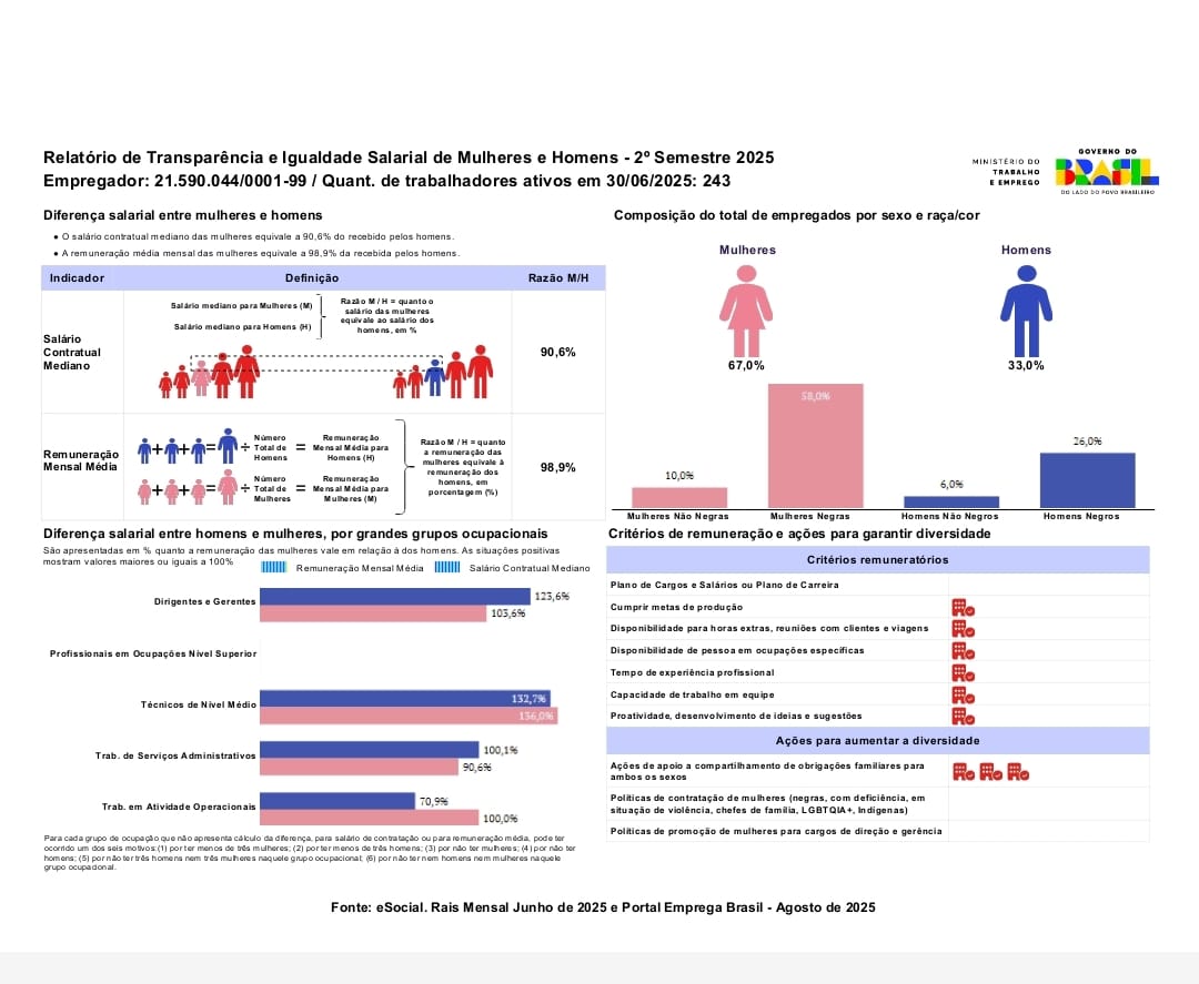 Gostaríamos de divulgar o Relatório de Transparência e Igualdade Salarial de Mulheres e Homens – 2º Semestre 2025. Este procedimento está em conformidade com a Lei nº 14.611/2023, Art. 5º, que estabelece a obrigatoriedade para empresas com cem ou mais empregados de publicar semestralmente o Relatório de Transparência Salarial e de Critérios Remuneratórios.